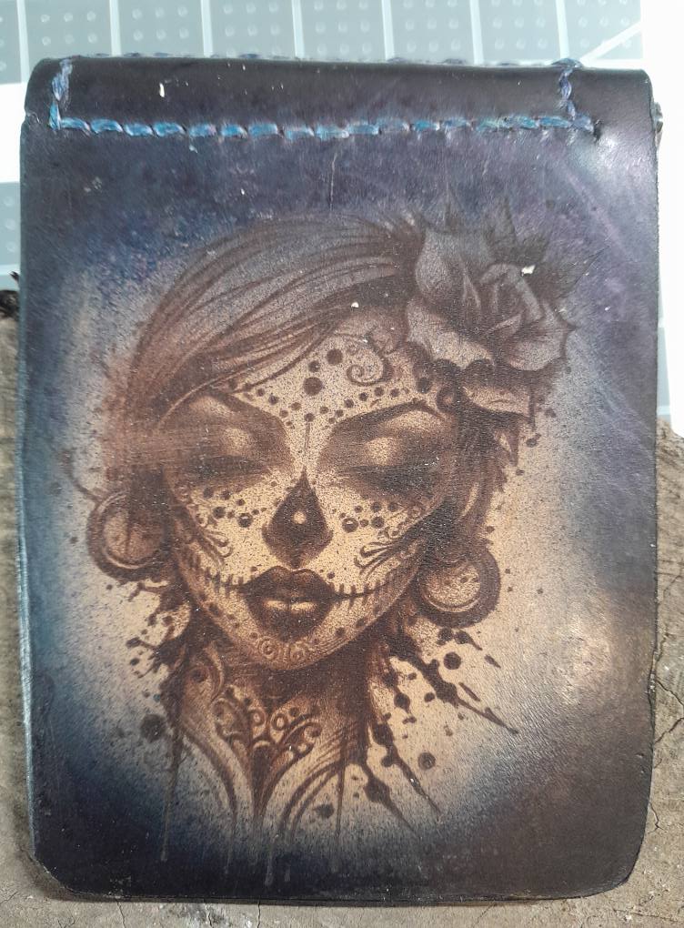 Heavy thread sewn money clip style billfold wallet. Thin, one or two card pockets and spring loaded money clip. Monogrammed and engraved with your favorite design or mine. I can do many designs, please look around the website for examples. I'd love to make one for you.